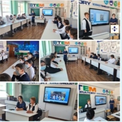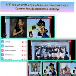 8"В" сынып оқушылары гимназия түлегі, С.Ж.Асфендияров атындағы Қазақ ұлттық университетінің білімгері Камиля Зульфухаровамен онлайн кезде...